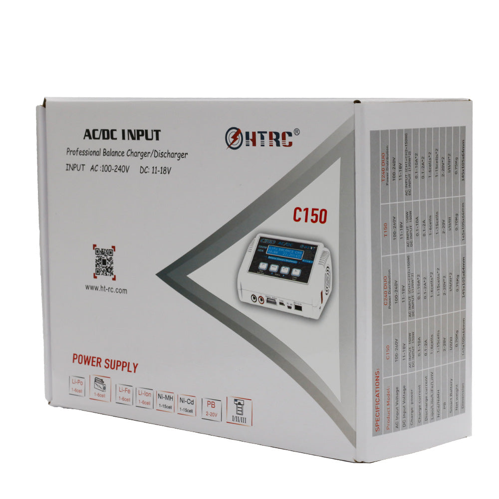 C150 is a new design multi-functional high power balance charger by HTRC,economic price,high quality.Utilizing 2x16 LED display,built-in cooling fan,DC 11-18V or AC 100-240V dual power.Max charger power 150w,Max charge current 10A.Designed for charging LiPo LiFe Lilon LiHV NiCd NiMh Pb Smart Batteries.