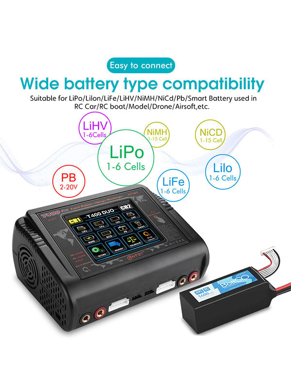 HTRC T400 Pro Lipo Battery Charger DC400W AC 200W 12A*2 Discharger RC For LiPo LiHV LiFe Lilon NiCd NiMh Pb battery