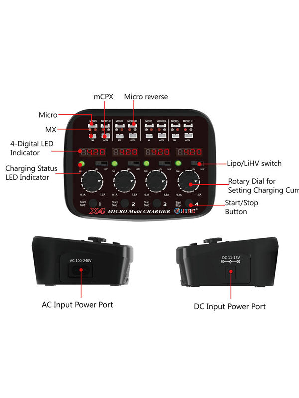 HTRC X4 1s Micro Battery Charger employs the circuit that features four totally independent but identical power outputs which are powered 6W each. It is designed for charging single cell LiPo. Insert the lead to the right connector in each port, the charger will charge 4 batteries at the same time. And the charging current can be adjusted from 0.1-1.5A by dial, the charging capacity and cell voltage can be displayed in each 4-digital LED indicators.